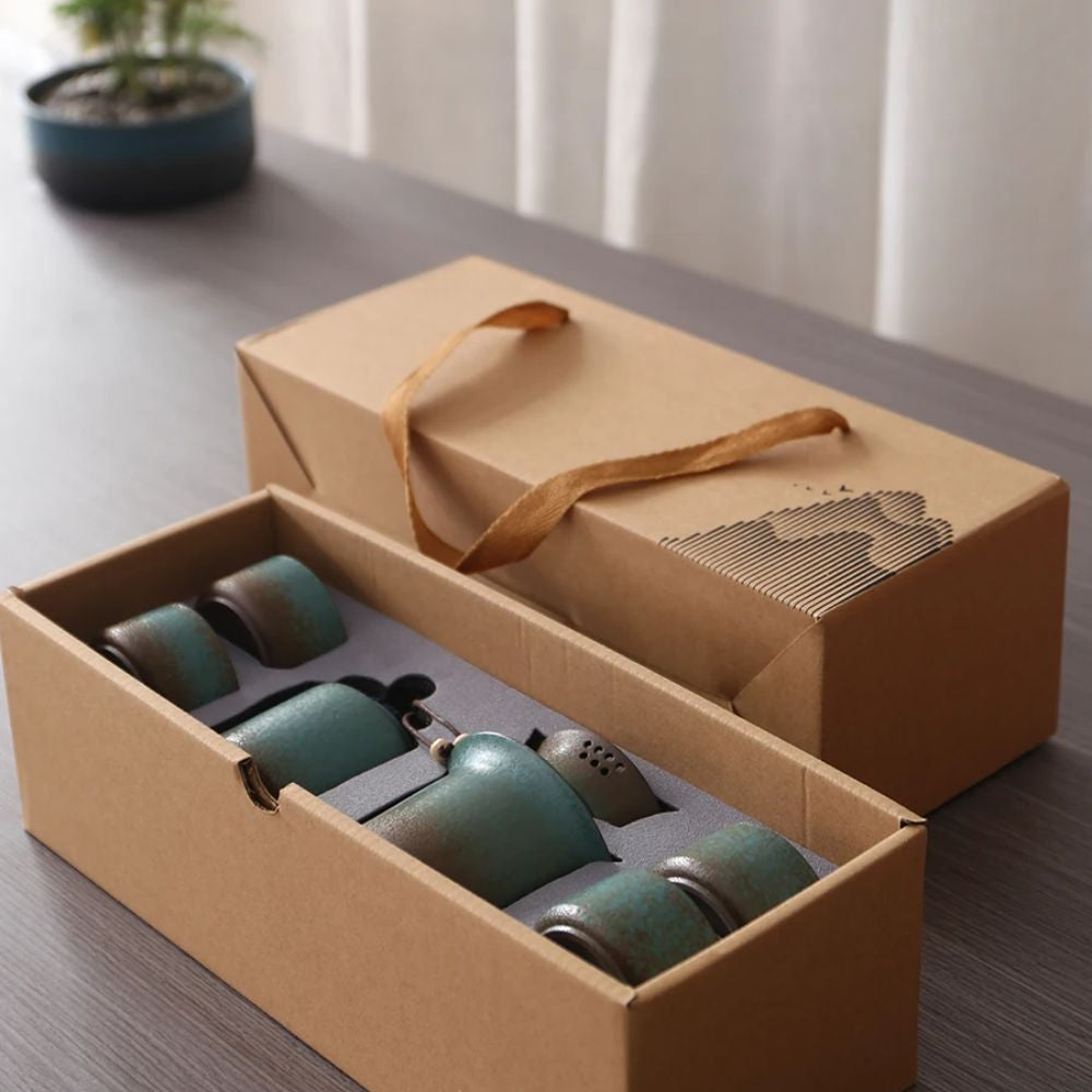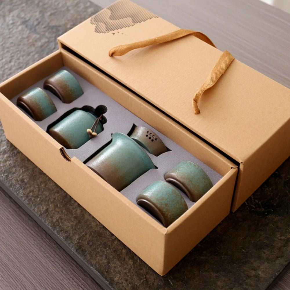 Apportez une touche d’authenticité à vos dégustations avec ce service à thé en céramique émaillée de style « kiln change ». Chaque pièce se distingue par des variations naturelles liées à la cuisson, offrant un rendu unique et artisanal. Complet et raffiné, il comprend une théière, quatre tasses et une boîte à thé assortie, idéal pour préparer et partager vos infusions préférées.
