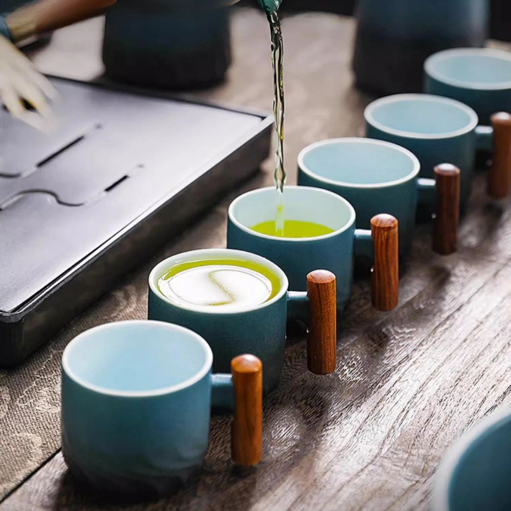 Tasse à thé artisanal vintage avec anse en bois céramique style wabi-sabi