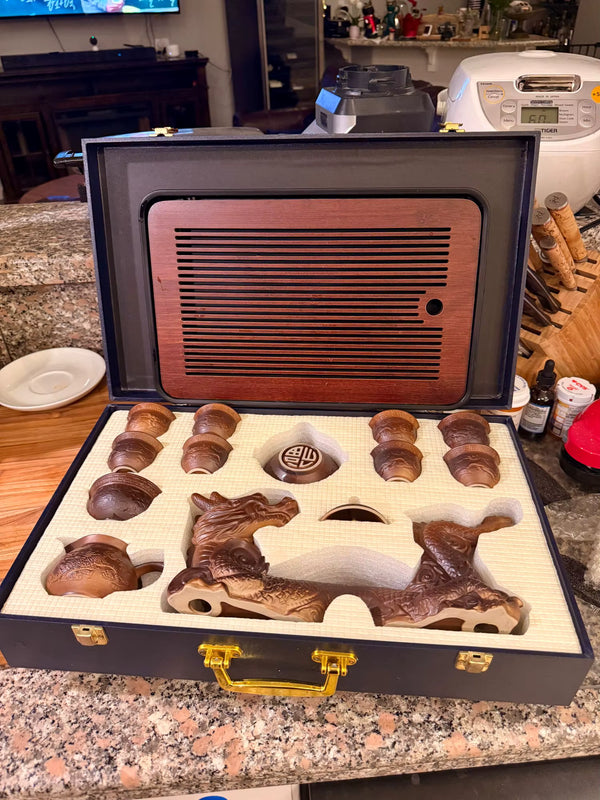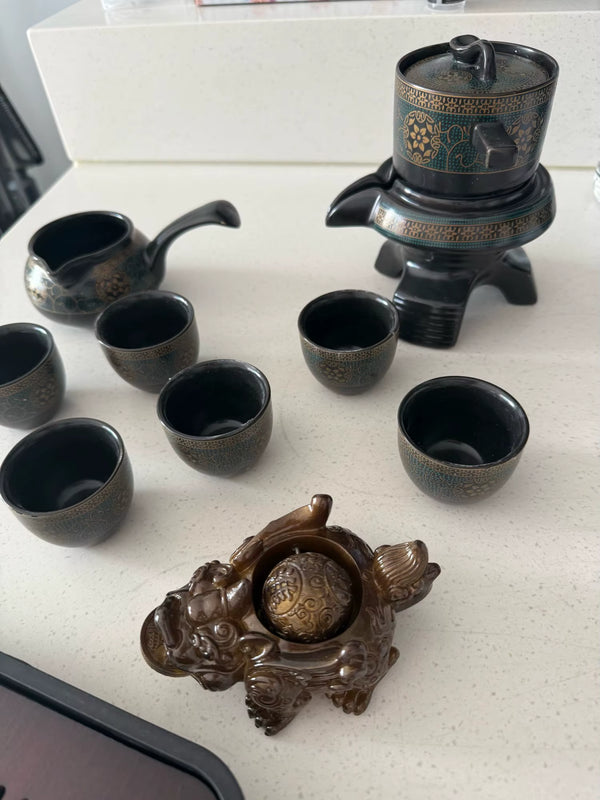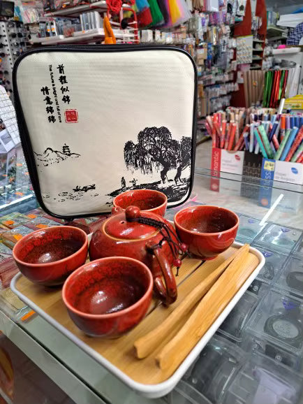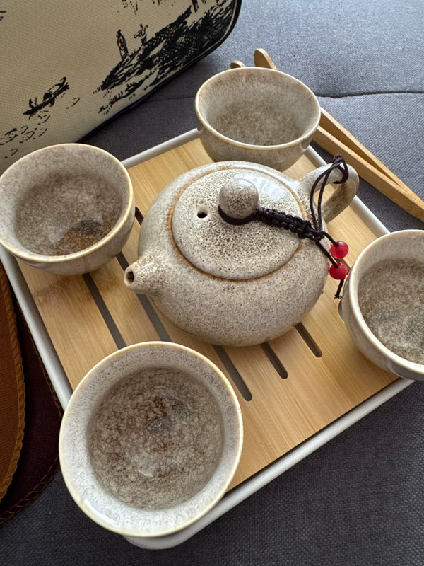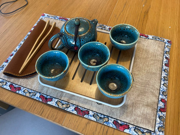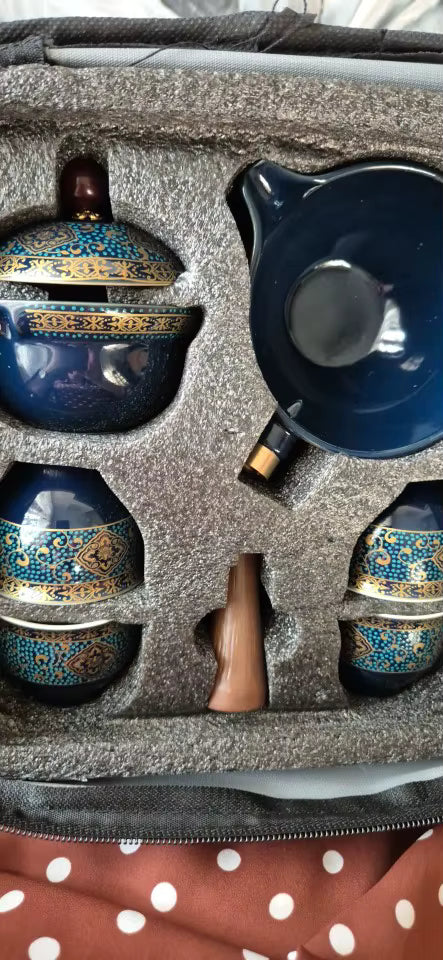 Apportez une touche d’authenticité à vos dégustations avec ce service à thé en céramique émaillée de style « kiln change ». Chaque pièce se distingue par des variations naturelles liées à la cuisson, offrant un rendu unique et artisanal. Complet et raffiné, il comprend une théière, quatre tasses et une boîte à thé assortie, idéal pour préparer et partager vos infusions préférées.